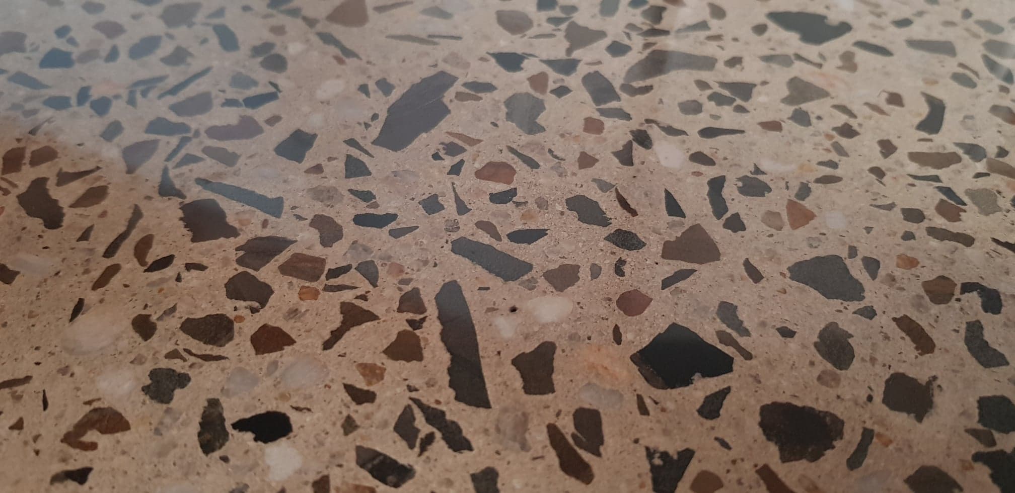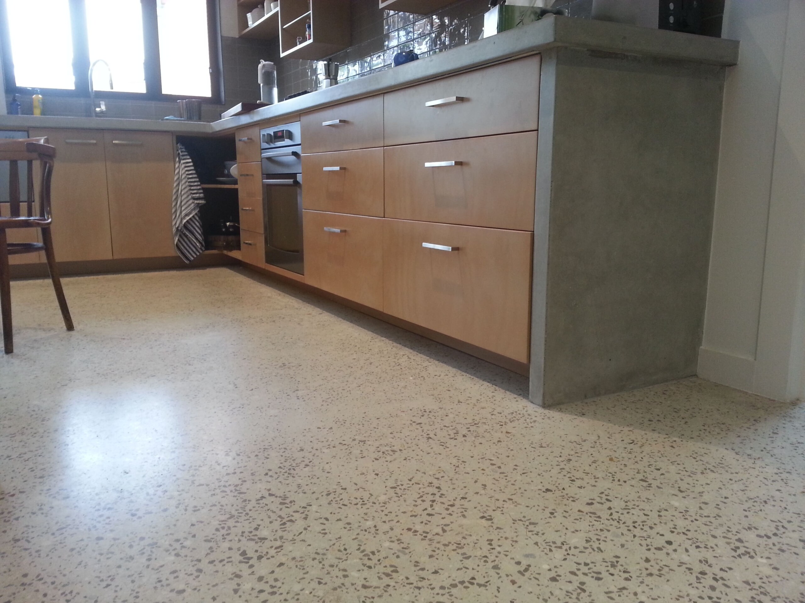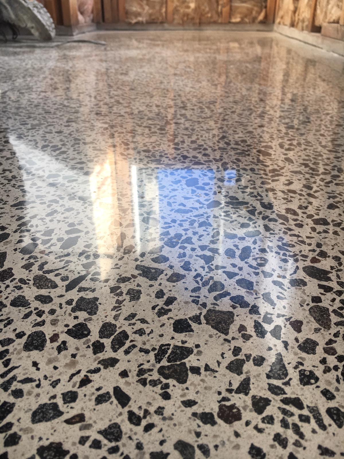 • Exposes and Enhances the Natural Concrete - The process involves grinding, honing, and polishing the actual concrete slab to reveal the embedded stones (aggregate) for a unique, high-end finish.
